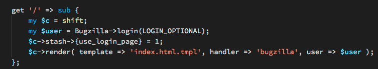 $c->render( template => 'index.html.tmpl', handler => 'bugzilla', user => $user );